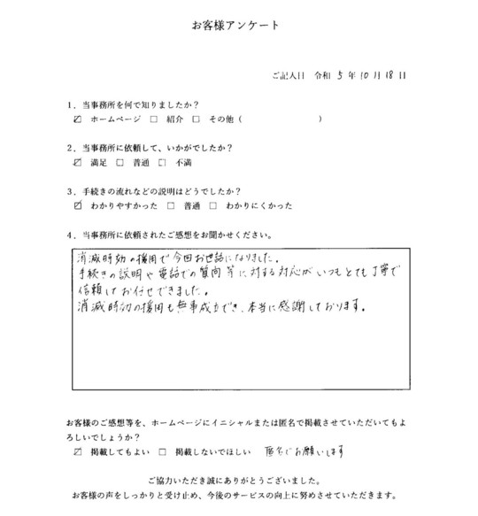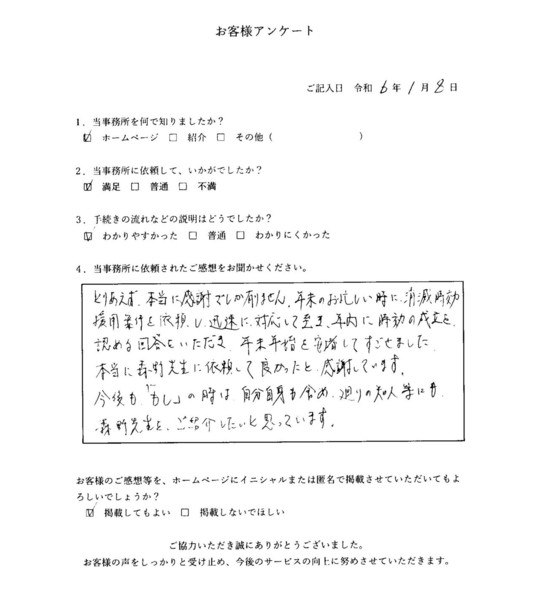とりあえず、本当に感謝でしか有りません。年末のお忙しいときに、消滅時効援用案件を依頼し、迅速に対応して頂き、年内に時効の成立を認める回答をいただき、年末年始を安堵してすごせました。