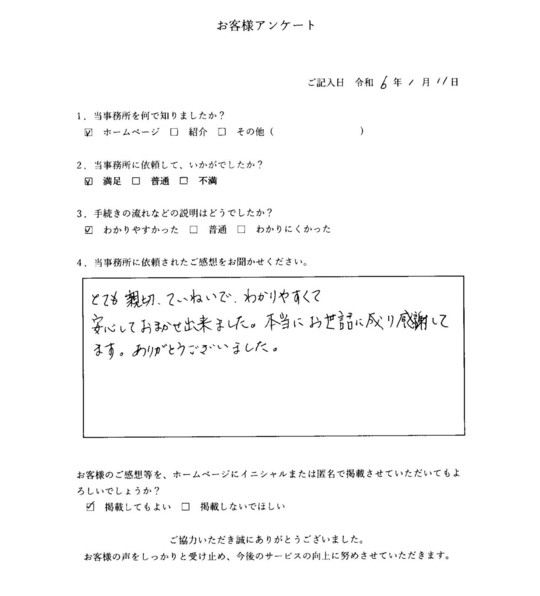 最初はとても不安がありましたが、話をしていくと、とてもわかりやすく、依頼して良かったと思います。