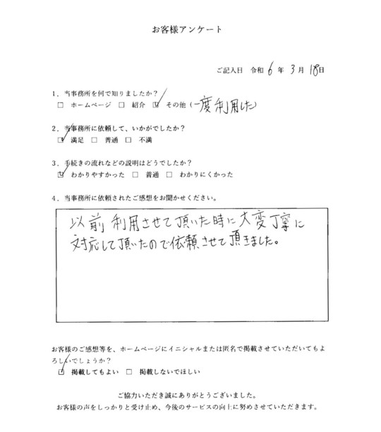 以前利用させて頂いた時に大変丁寧に対応して頂いたので依頼させて頂きました。