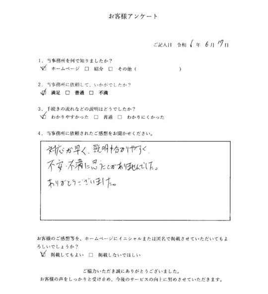 対応が早く、説明も分かりやすく、不安・不満に思うことがありませんでした。