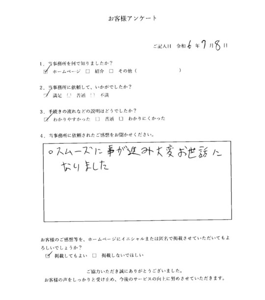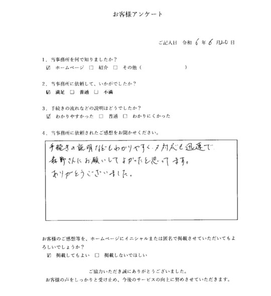 手続きの説明などもわかりやすく、又対応も迅速で、森野さんにお願いしてよかったと思ってます。