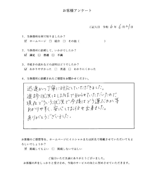 進捗状況はLINEで知らせていただいたので、現在どういう状況で今後はどう運ぶのか等わかりやすく、安心してお任せ出来ました。