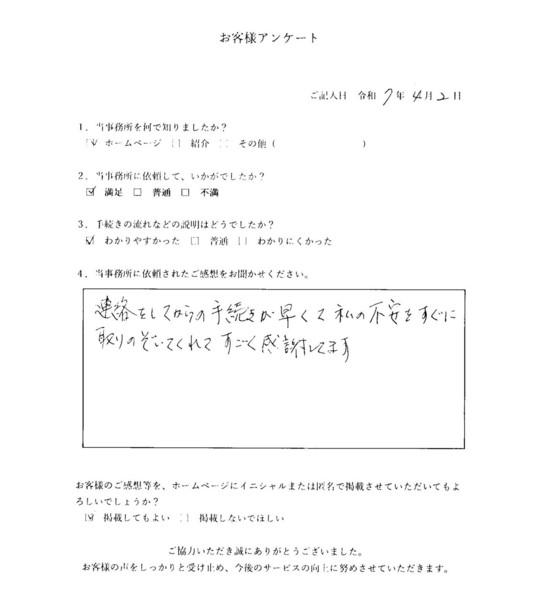 連絡をしてからの手続きが早くて、私の不安をすぐに取りのぞいてくれて、すごく感謝してます。