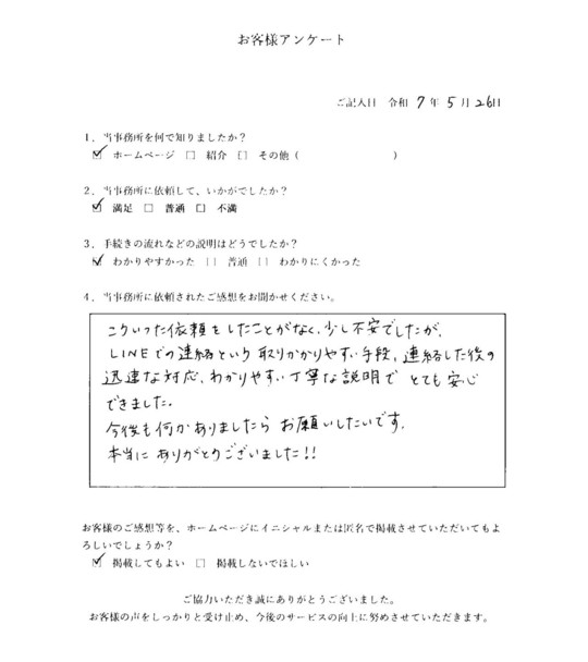 こういった依頼をしたことがなく、少し不安でしたが、LINEでの連絡という取りかかりやすい手段、連絡した後の迅速な対応、わかりやすい丁寧な説明で、とても安心できました。