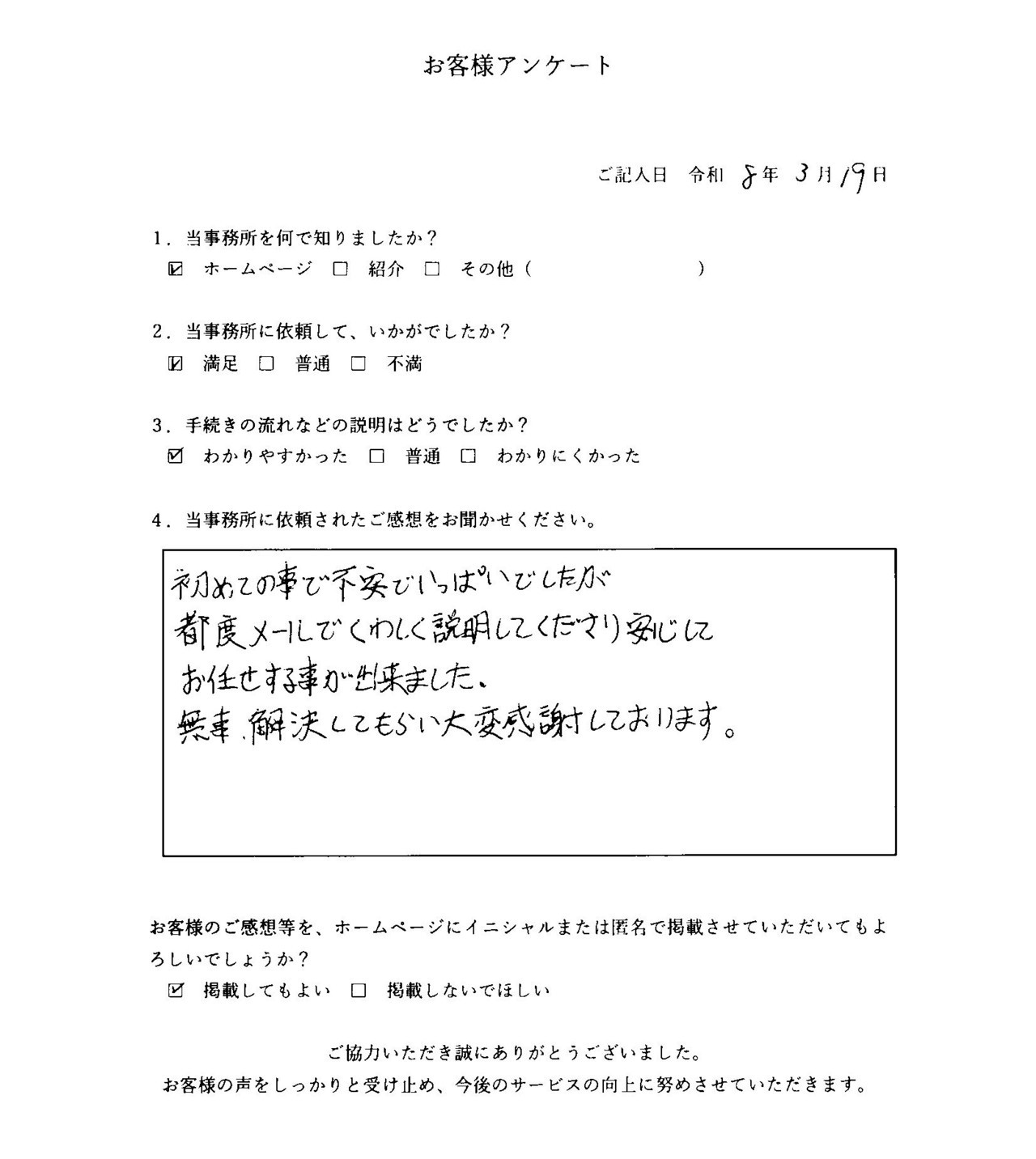 初めての事で不安でいっぱいでしたが、都度メールでくわしく説明してくださり、安心してお任せする事が出来ました。