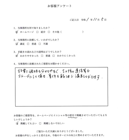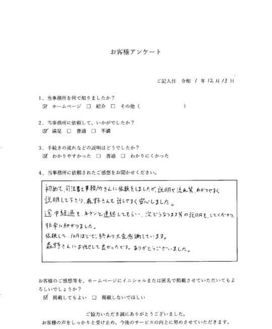 初めて、司法書士事務所さんに依頼をしましたが、説明や流れ等わかりやすく説明して下さり、森野さんも話しやすく安心しました。